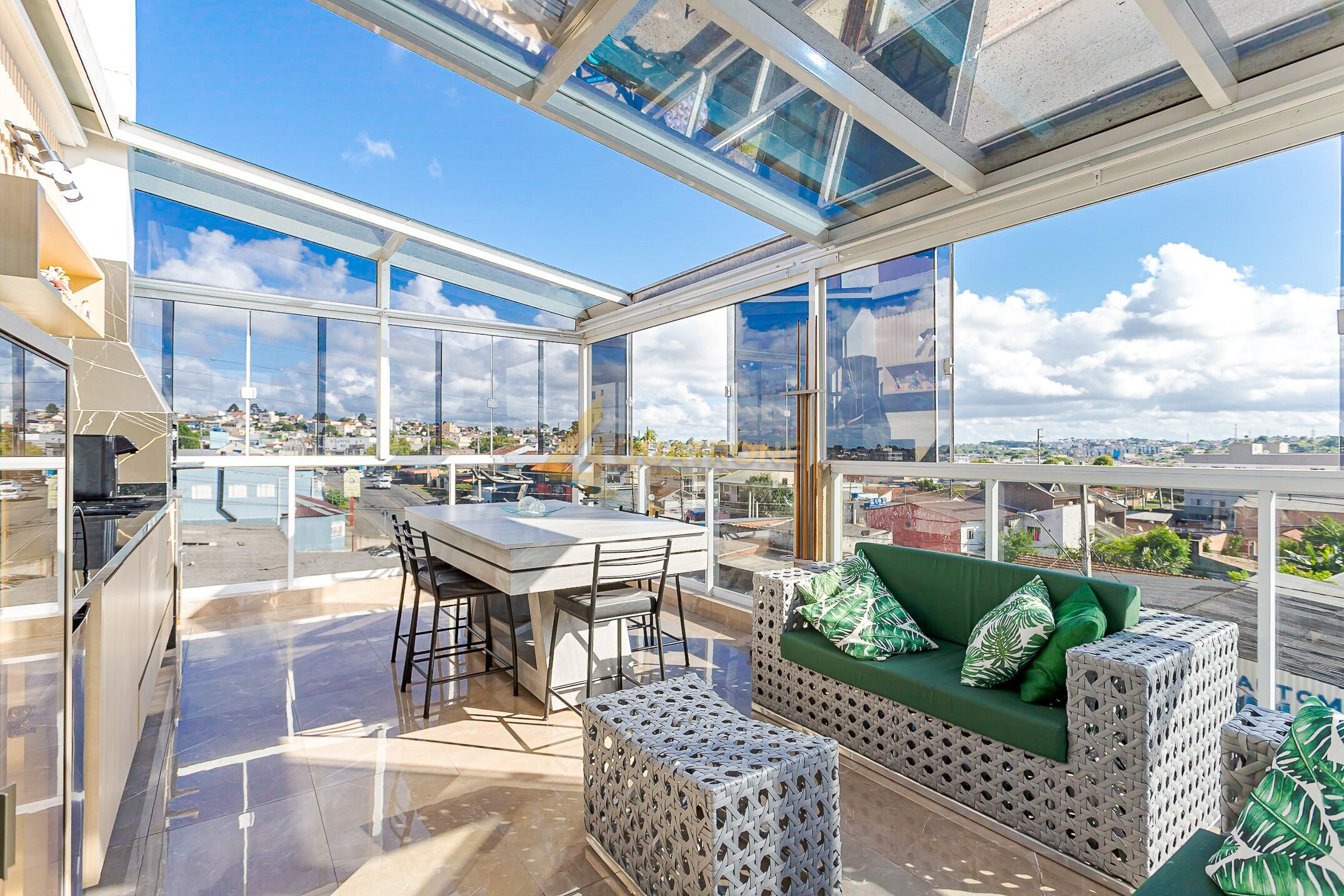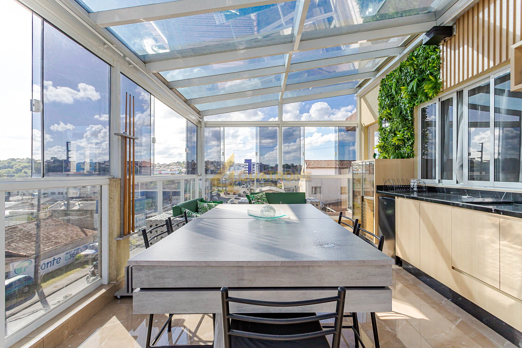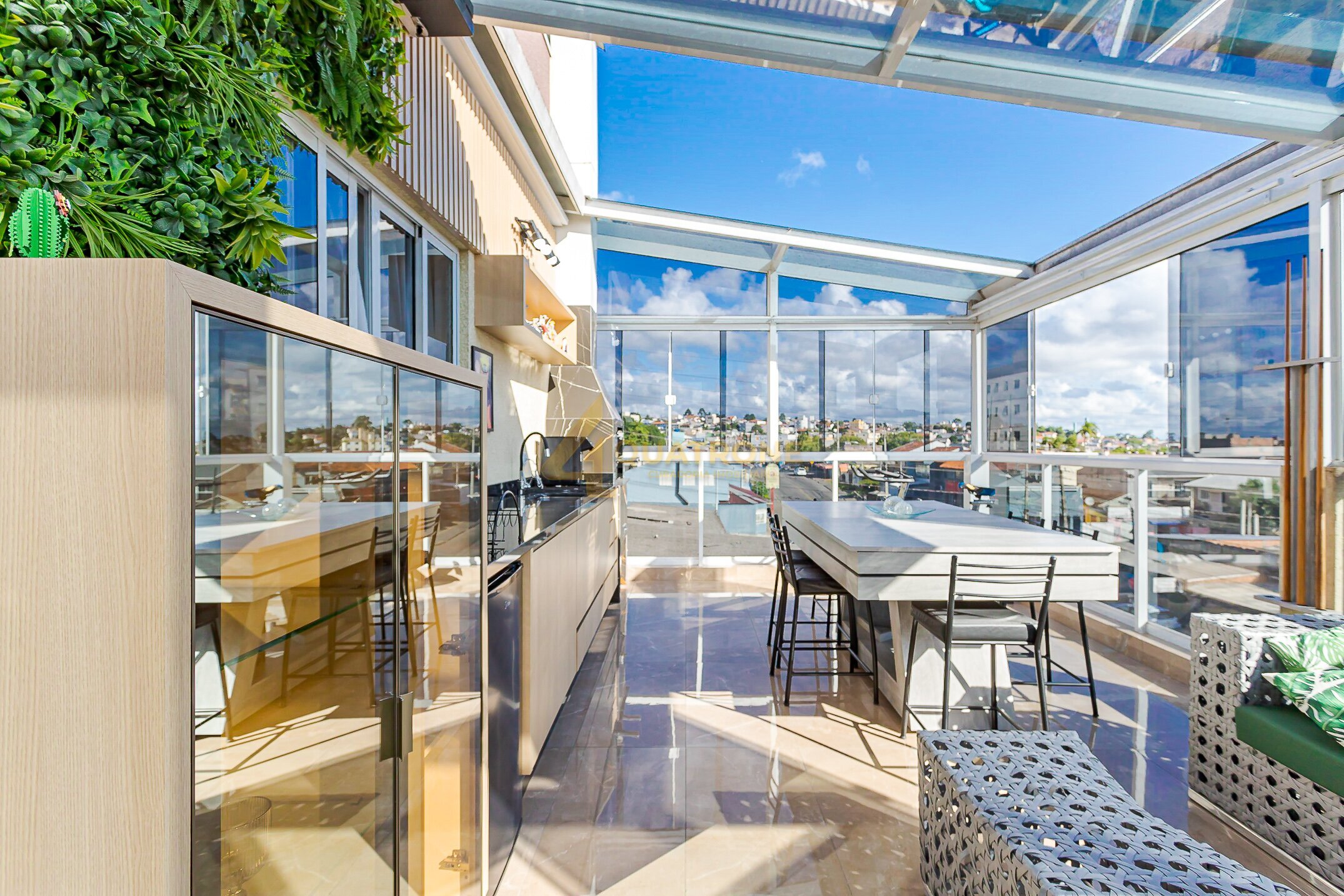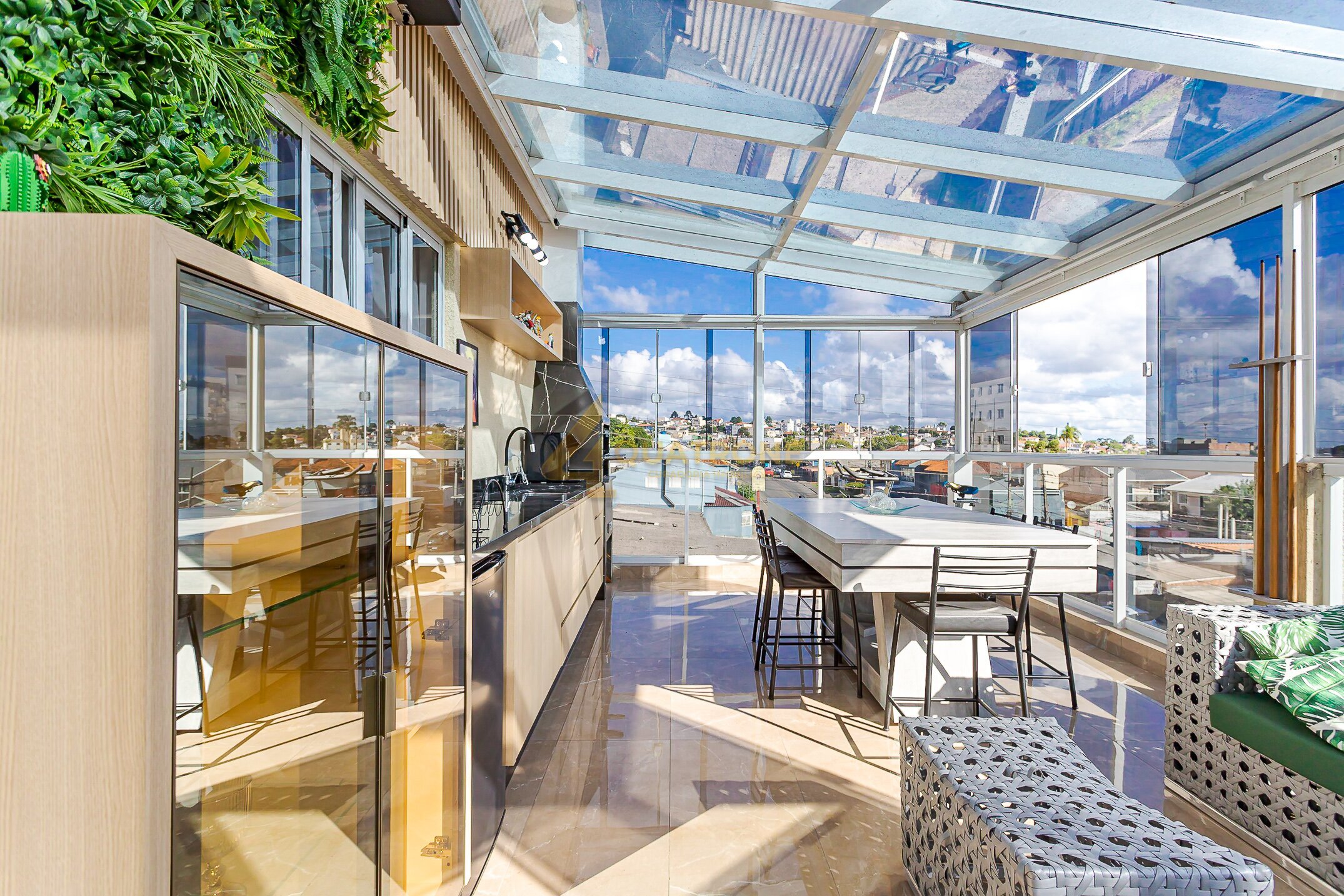 Espaço gourmet com churrasqueira e coberto com aproximadamente 30m², estrutura em vidro retrátil e uma vista simplesmente incrível — um ambiente único, exclusivo e perfeito para momentos especiais.