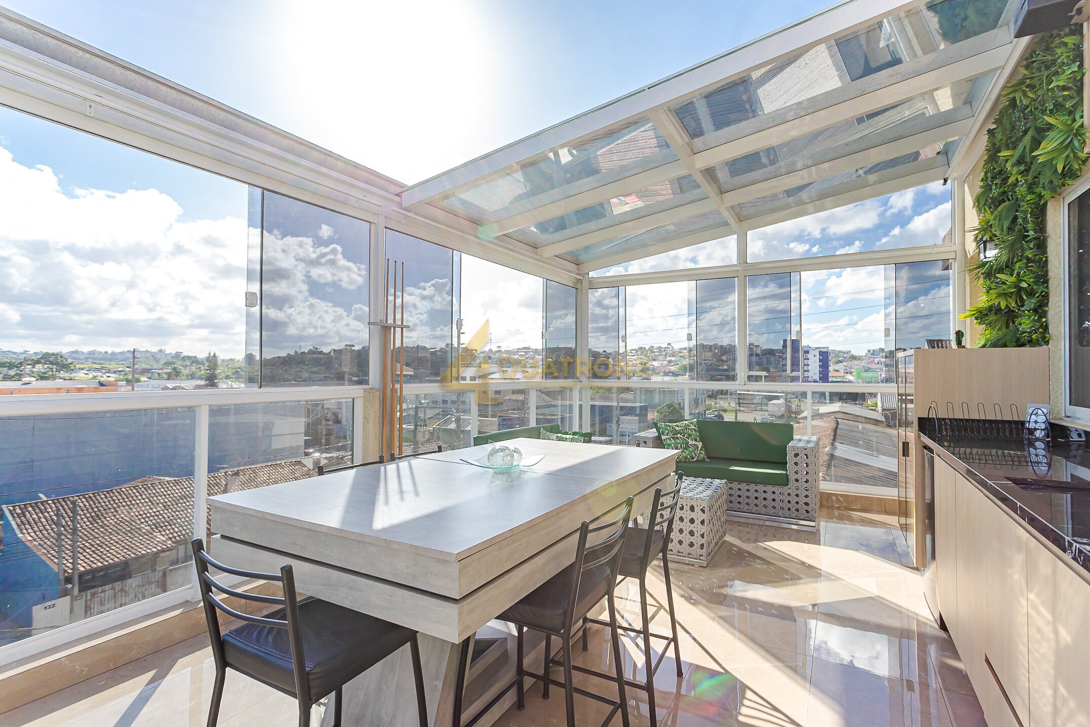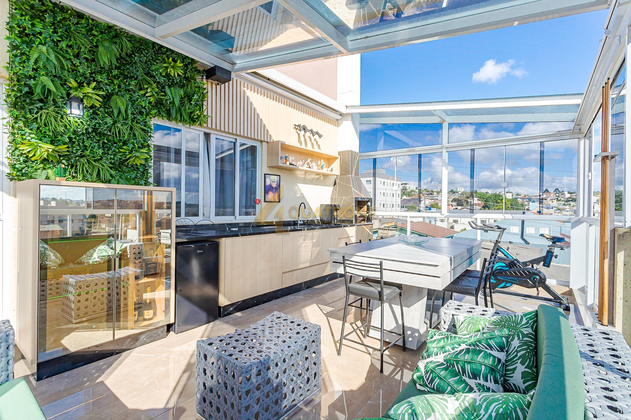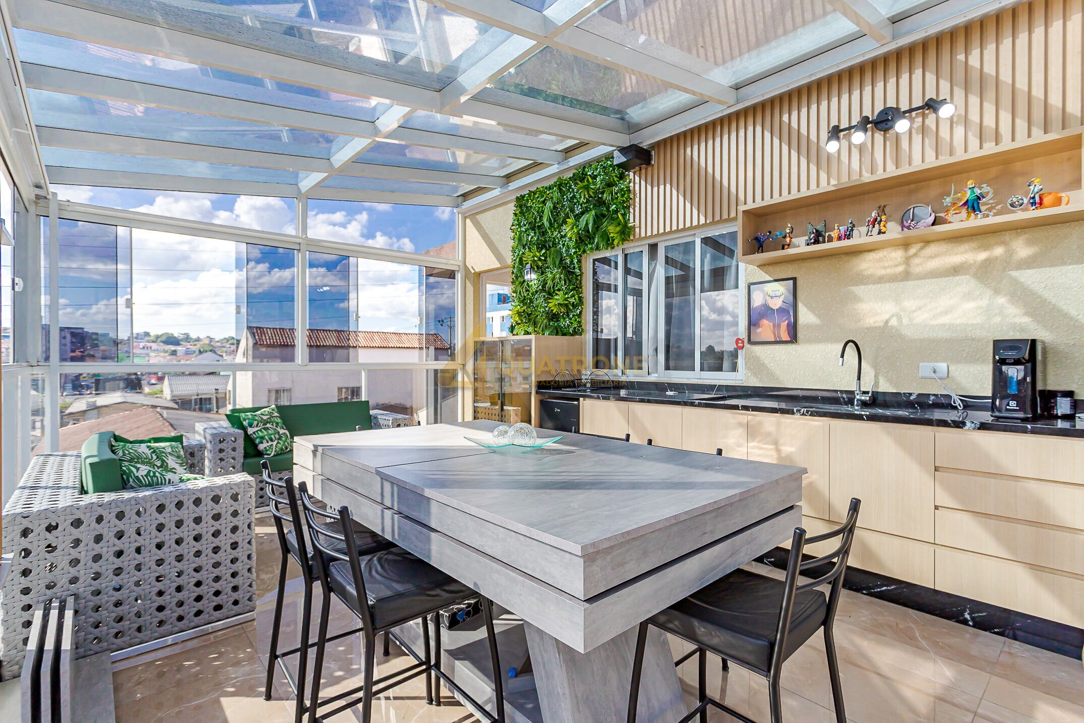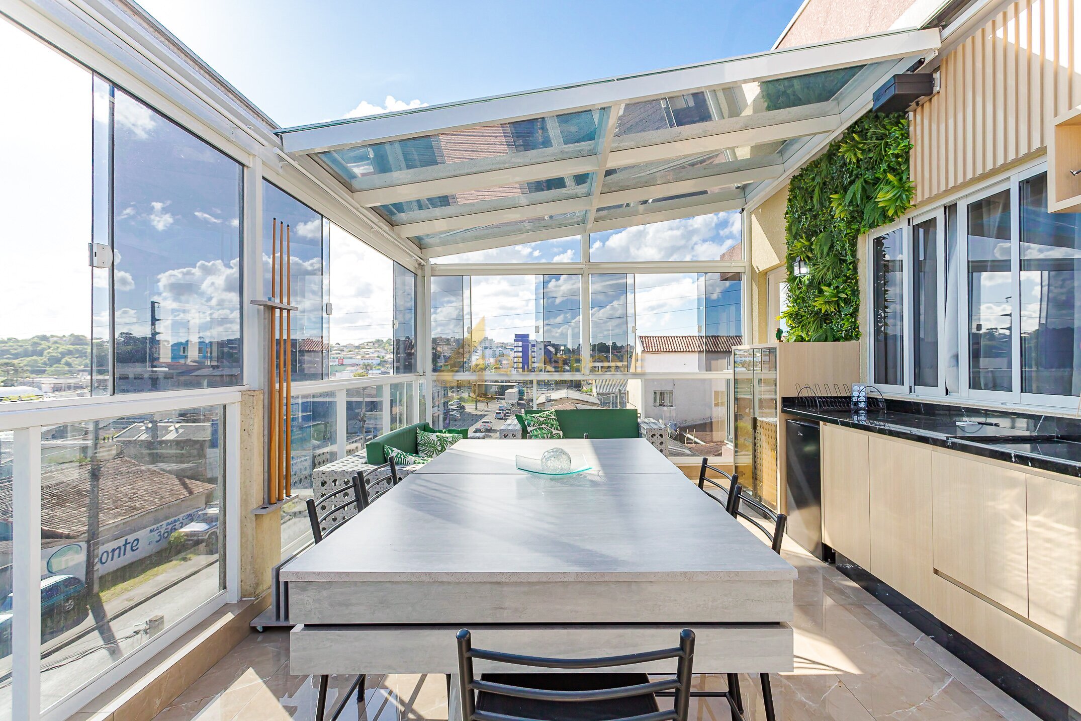 Espaço gourmet com churrasqueira e coberto com aproximadamente 30m², estrutura em vidro retrátil e uma vista simplesmente incrível — um ambiente único, exclusivo e perfeito para momentos especiais.