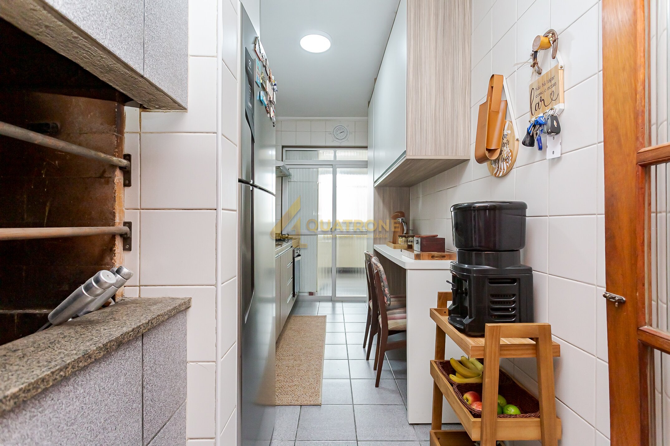 A cozinha traz um detalhe que conquista imediatamente: churrasqueira a carvão, perfeita para quem valoriza receber amigos e família sem abrir mão da praticidade de um apartamento.