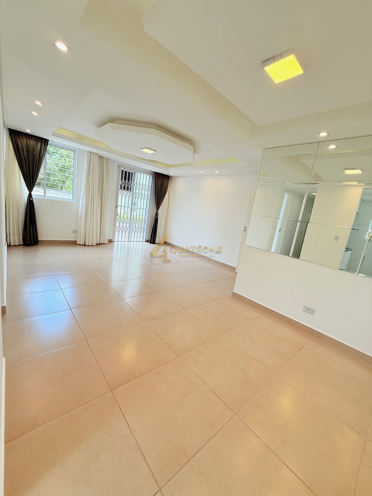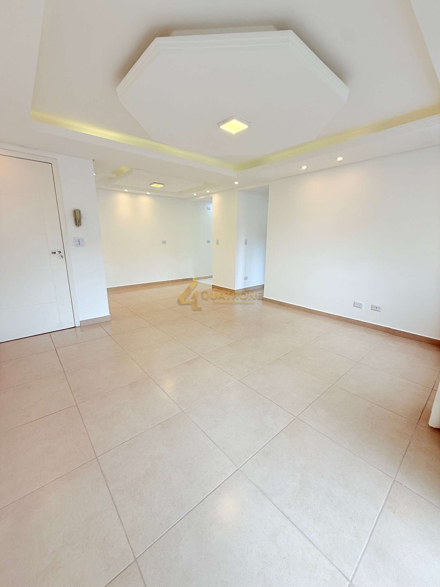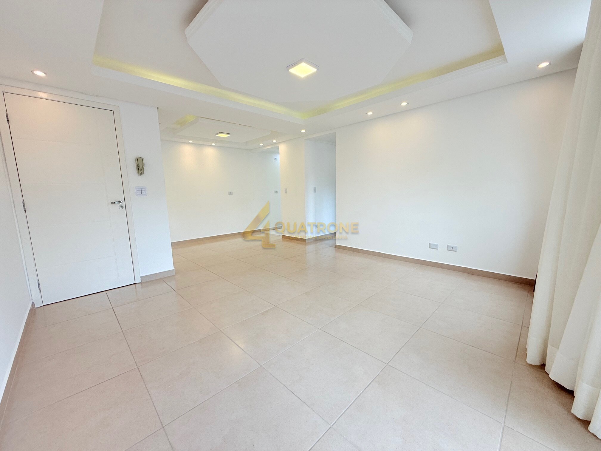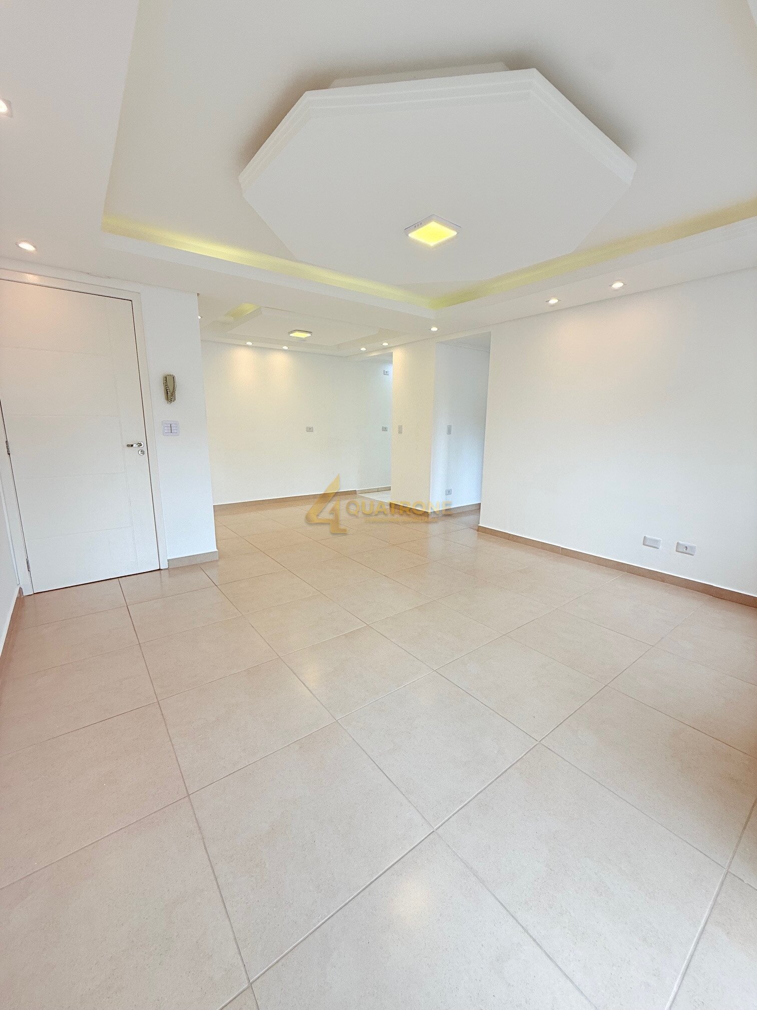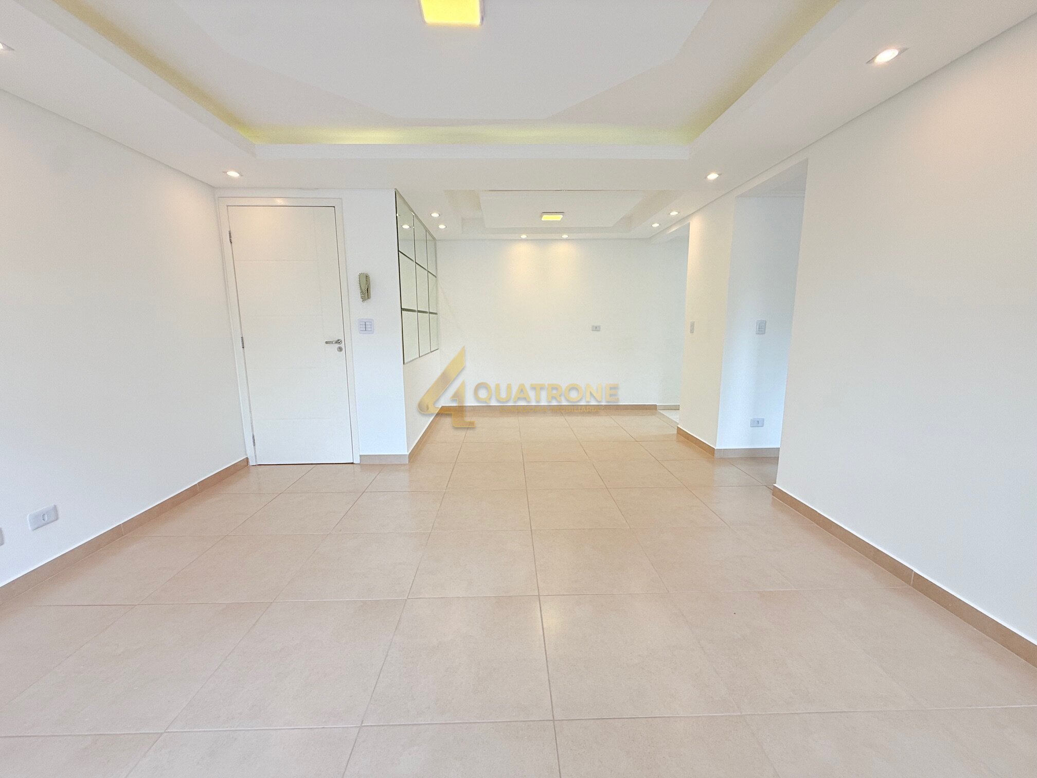 A sala ampla para dois ambientes possui rebaixamento em gesso e iluminação com spots, criando um visual sofisticado.