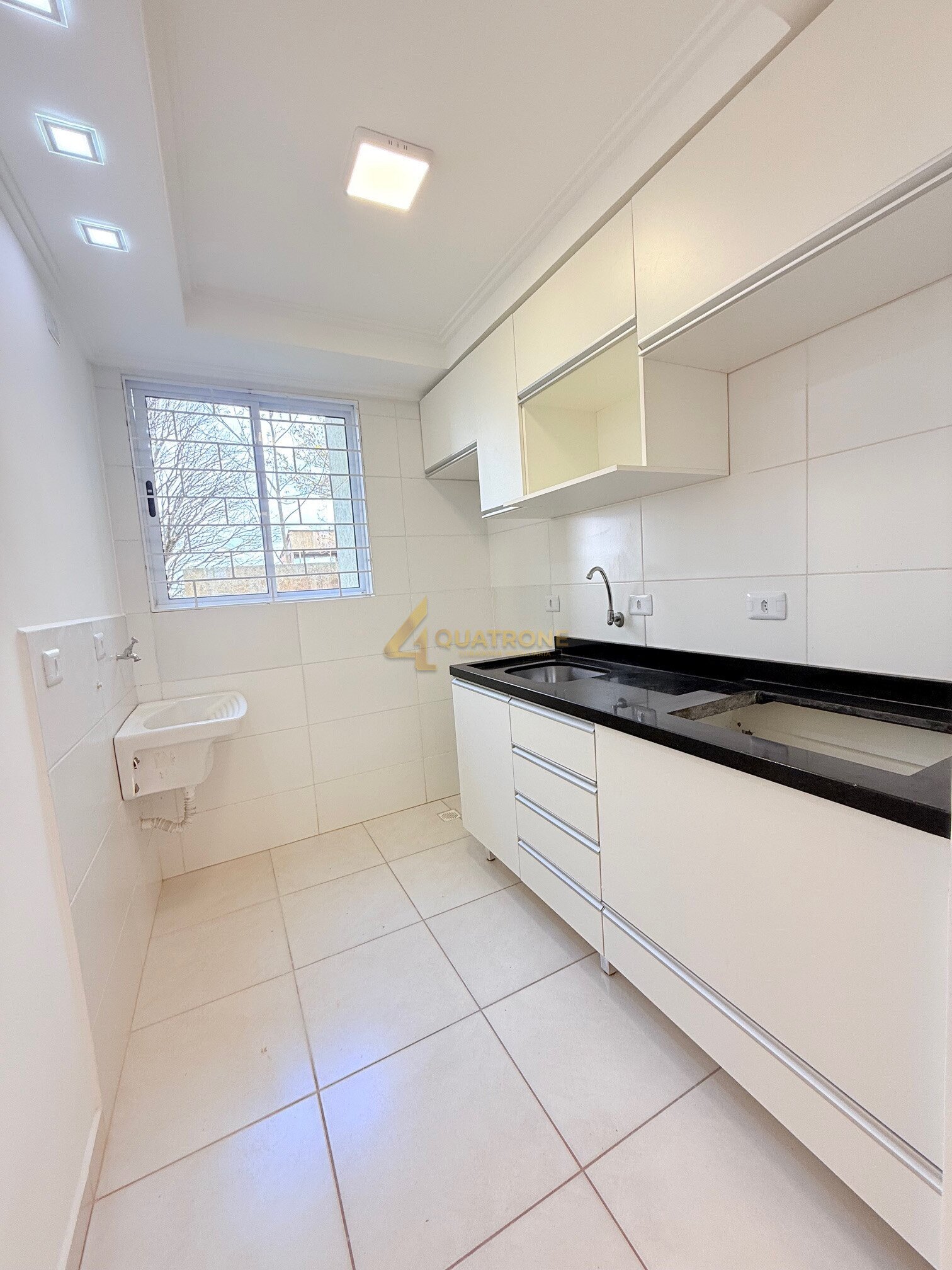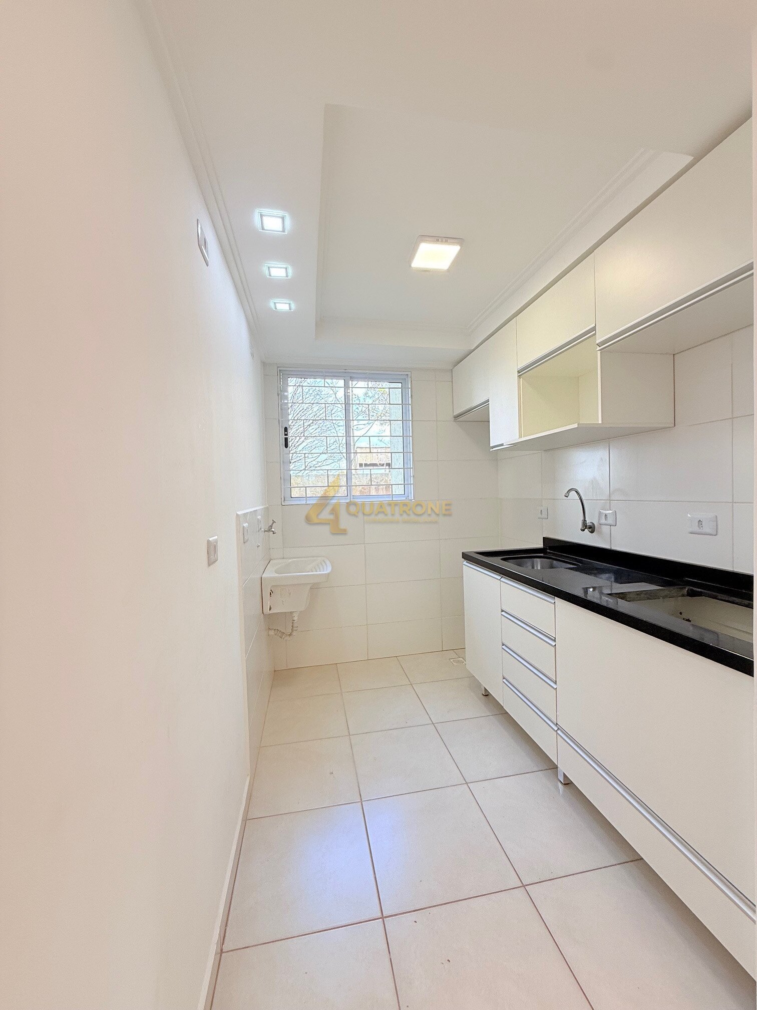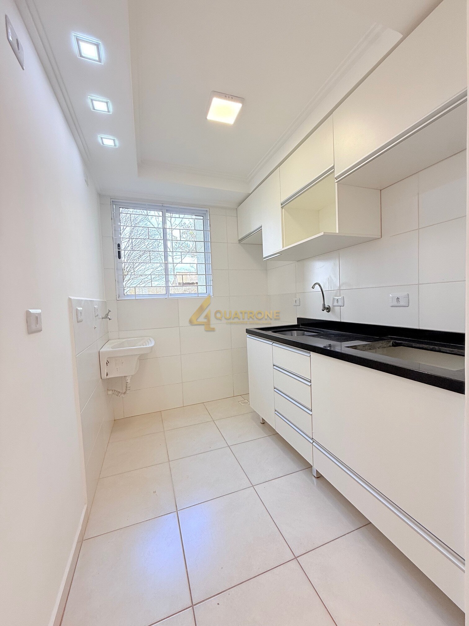 A cozinha americana com armários novos se integra perfeitamente à área social, e a lavanderia conjugada otimiza o espaço.